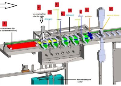 3) If necessary, detergent is sprayed on the plate – In some cases detergent is not necessary, this depends upon the contamination of the plate, the speed, the required level of cleanliness